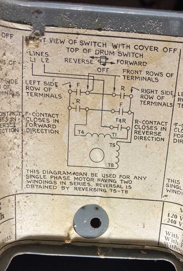 I dug through my box of switches and came across a drum switch which was rated for the 1.5HP Dayton motor. Here is the shot of the wiring diagram from inside the cover of the drum switch…